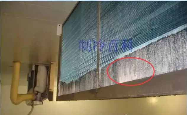 局部結(jié)霜以后,由于在蒸發(fā)器表面形成了隔熱層而該區(qū)域換熱量低,冷媒膨脹便轉(zhuǎn)移到其他區(qū)域,逐漸的出現(xiàn)整個蒸發(fā)器結(jié)霜或結(jié)冰現(xiàn)象,整個蒸發(fā)器形成隔熱層,于是膨脹便蔓延到壓縮機回氣管導(dǎo)致壓縮機回氣結(jié)霜。