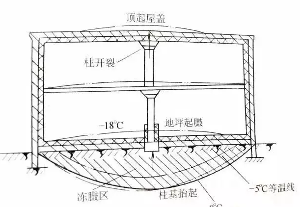 低溫庫的溫度常年在0℃以下,若地坪下土層得不到熱量的補(bǔ)充,將使0℃等溫線逐漸移至土層中,使土層的水分受凍成冰。由于溫差的存在及冰晶的形成,土壤上下層之間產(chǎn)生的水蒸氣分壓力差,使下層土壤中的水蒸氣不斷向上層移動(dòng),導(dǎo)致冰凍體逐漸擴(kuò)大。隨著時(shí)間的推移,0℃等溫線不斷的向土層深入,土層中的凍冰體也不斷的加大水分結(jié)冰產(chǎn)生的體積膨脹力最終將引起地坪凍臌或地基凍脹現(xiàn)象,危機(jī)建筑結(jié)構(gòu)安全。因此,低溫冷庫的地坪除了設(shè)置隔熱層、隔氣防潮層之外,還要采取地坪防凍措施,使地坪下的土層保持在0℃以上。